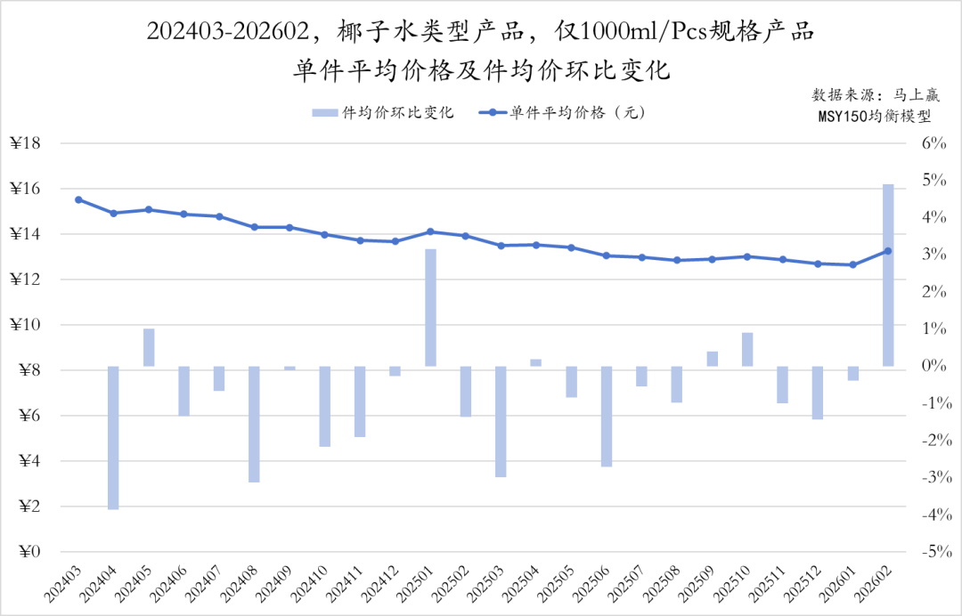 进一步锁定一个规格看其件均价的走势,以椰子水类型产品中常见的1L/件规格的产品为例,都是椰子水、都是同样的规格,其件均价从2024年3月高点时的将近16元/件,下行到2026年1月仅略高于12元/件,单件均价下降近4元,促销力度约等于买三送一。从单件均价的环比价格变动也能看到这一趋势,观察期内除了春节、中秋等节庆外,基本绝大多数月份其件均价都处于环比下行的通道中,跌跌不休。