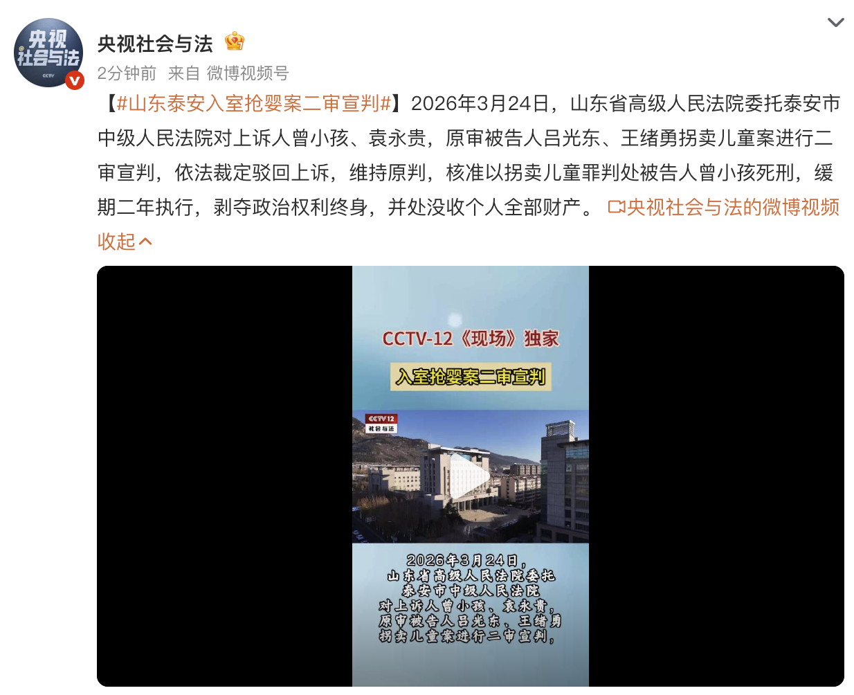 2026年3月24日,山东省高级人民法院委托泰安市中级人民法院对上诉人曾小孩、袁永贵,原审被告人吕光东、王绪勇拐卖儿童案进行二审宣判,依法裁定驳回上诉,维持原判,核准以拐卖儿童罪判处被告人曾小孩死刑,缓期二年执行,剥夺政治权利终身,并处没收个人全部财产。(央视社会与法)