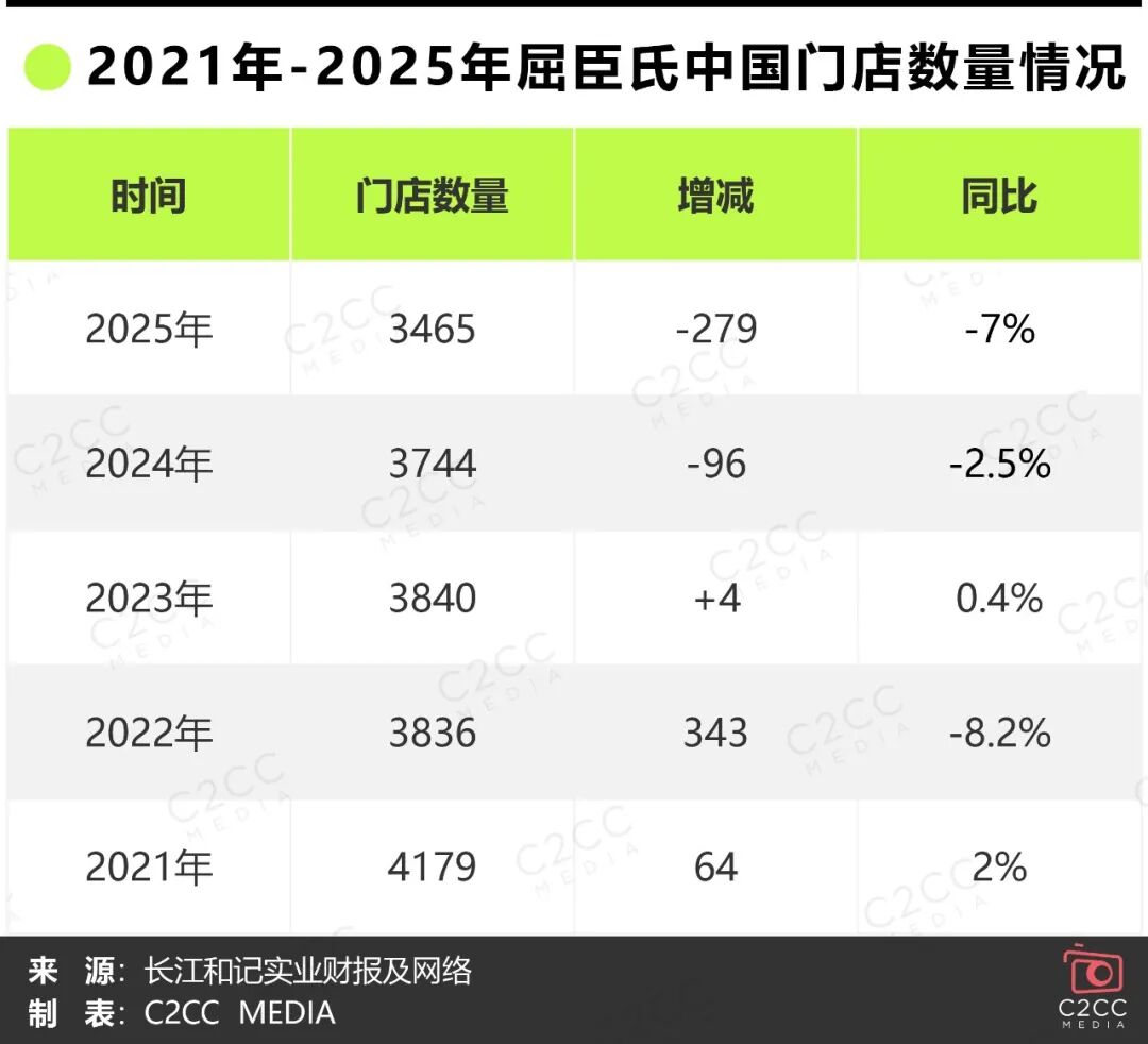 截至2025年末,2025年屈臣氏中国净关店279家,门店总数从年初的3744家缩减至3465家,占全球门店总数的20%,但营收仅占全球总营收的6%。将时间线拉长,从2021年的4179家门店,到2025年的3465家,屈臣氏五年间累计关闭了中国内地门店714家,平均每3天就有1家门店退出市场。