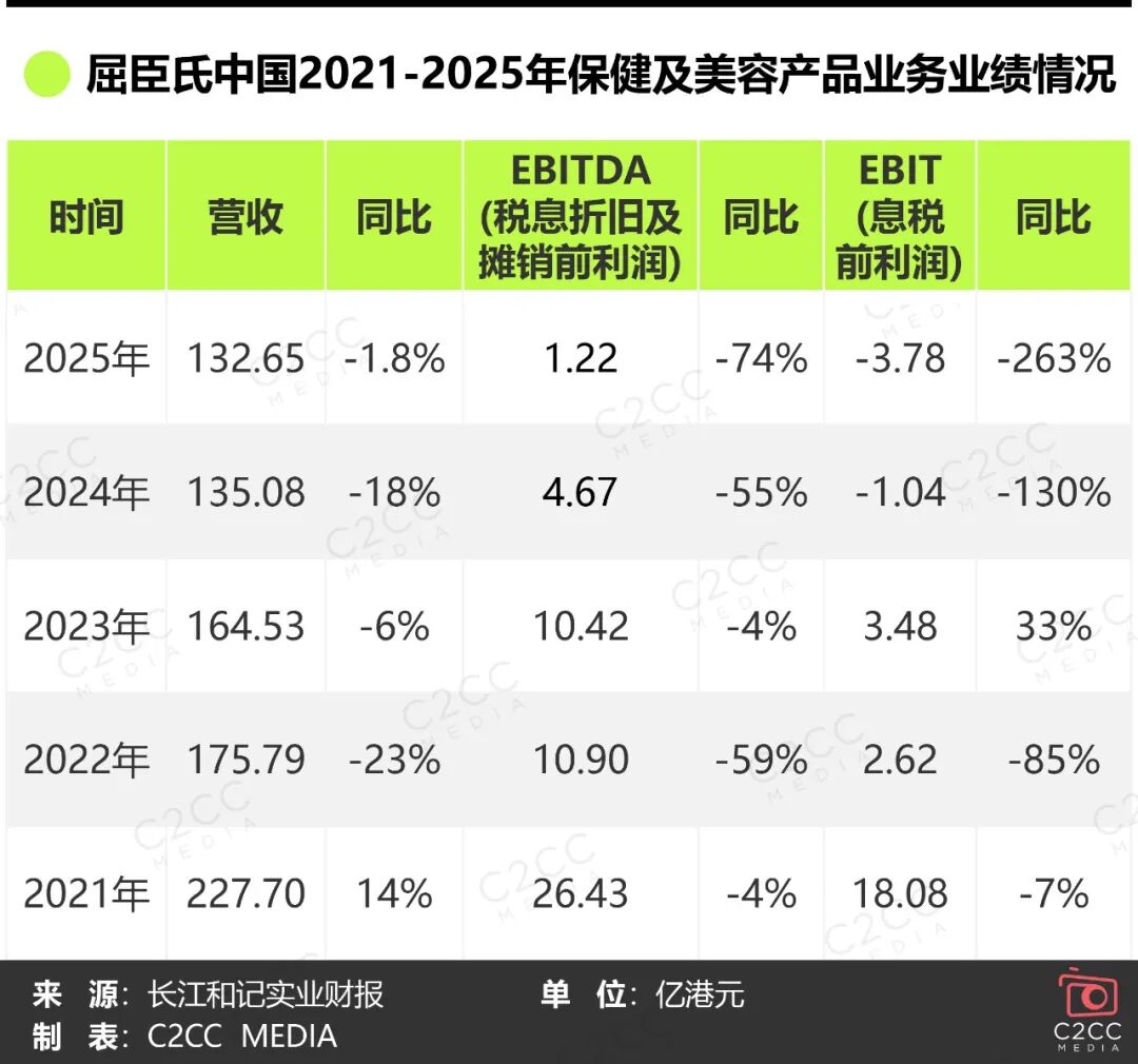 可镜头转到中国市场,画风瞬间急转直下。屈臣氏中国营收连续多年下滑,2025年营收为132.65亿港元,同比小幅下滑1.8%,而此前2024年营收同比下滑18%,即使2025年降幅收窄,但依旧没能扭转负增长趋势。另外,利润端呈现“崩盘式下跌”:全年EBITDA同比暴跌74%,EBIT(息税前利润)更是狂跌263%,直接陷入亏损,亏损额达到3.78亿港元。中国市场成为集团内唯一一个营收和利润双下滑的市场。