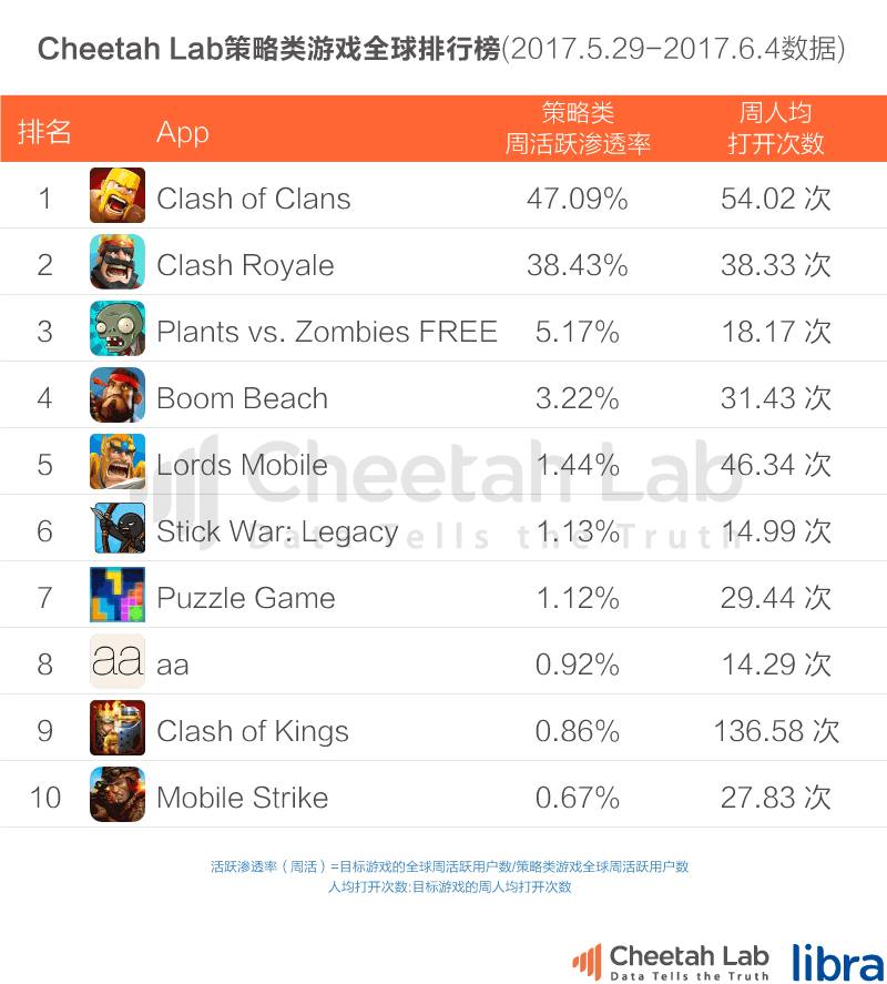 在Cheetah Lab(原猎豹全球智库)的策略类榜单上,COC 和其兄弟游戏《皇室战争》的活跃渗透率以巨大优势占据前两位。