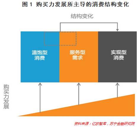 就广义范围来分析,从消费者温饱型需求(基本生存)、服务型需求(以“安全”和“娱乐”为代表)与自我实现型需求(以“认同”、“尊重”为核心)这三类需求出发,一方面,社会整体购买力的提升,会使温饱、服务与实现三类需求按不同比例得到满足,促进结构性变化;另一方面,当社会文化引起消费心理发生较大变化时,温饱、服务与实现三类消费之间会直接发生平移转变。这两种变化,都会带来消费品行业的震荡和消费品类的洗牌,如下图1。