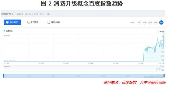 狭义的“消费升级”概念进入公众视野,则是自2016年8月开始,如下图2百度指数折线图。在此之前,“消费升级”于整个资本圈内缓慢升温,并最终通过投资峰会、机构自媒体等渠道向外界扩散。