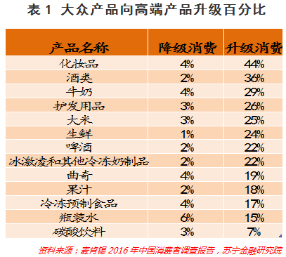 《麦肯锡2016中国消费者调查报告》显示的大众产品向高端产品升级的百分比(参见下表1)表明,2016年中国消费者的升级消费主要集中在化妆护理用品、饮品与生鲜食品领域。