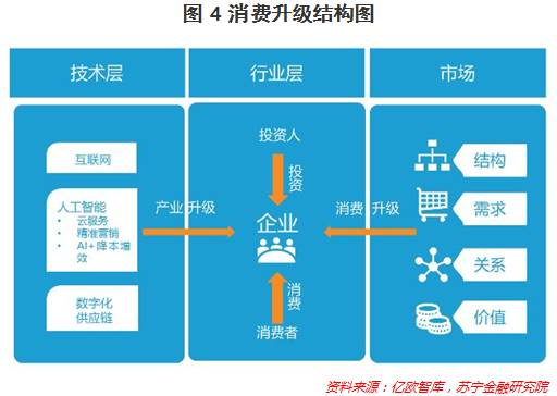 (2)社会(Social):“产业升级”和“消费升级”作为同一事物的一体两面发生。当前,互联网“免费经济”红利正在缓慢消退,消费者一定程度上厌倦伴随“低价”与“免费”而来的质量问题、消费过度问题,对品质的追求开始代替对数量和廉价的追求,尤其是在宏观经济不甚景气的情况下,消费者遵循“口红效应”,对高质量、低客单价的消费品情有独钟。市场偏好变向,将引致行业层面做出升级反应,这反过来又会进一步推动消费升级(参见图4)。