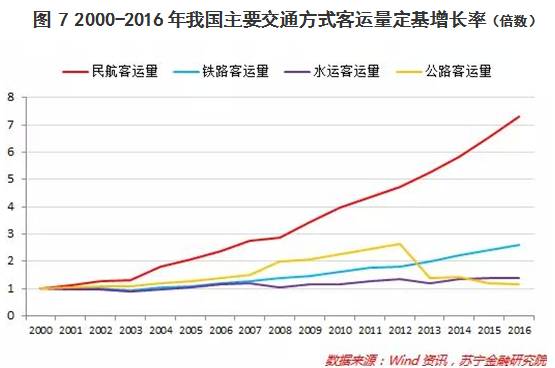 4、交通出行:飞机、高铁渐成大众的出行首选。据近期官方披露的数据显示,2016年民航客流量较2000年的6700万增长了7.3倍,客座率高达82.7%。在主要的交通方式中,民航的增长率是最快的,呈45度角上升,如下图7。高铁出行也获得了稳定增长,成为最受欢迎的地面交通工具。行业内相关优质公司股票值得关注。