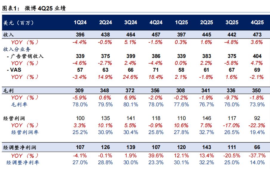 Q4微博的成本和费用总计3.82亿美元,同比增长13%,而同期收入增长只有4%。增加的部分主要来自广告制作成本上升和营销费用加大。经营利润率从去年同期的26%收窄至19%,GAAP口径下,单季度归属股东出现了470万美元的净亏损,是2025年四个季度里最难看的一份单季成绩单。