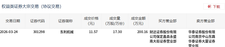 3月24日,东利机械大宗交易成交17.3万股,成交额200.16万元,占当日总成交额的3.22%,成交价11.57元,较市场收盘价15.15元折价23.63%。