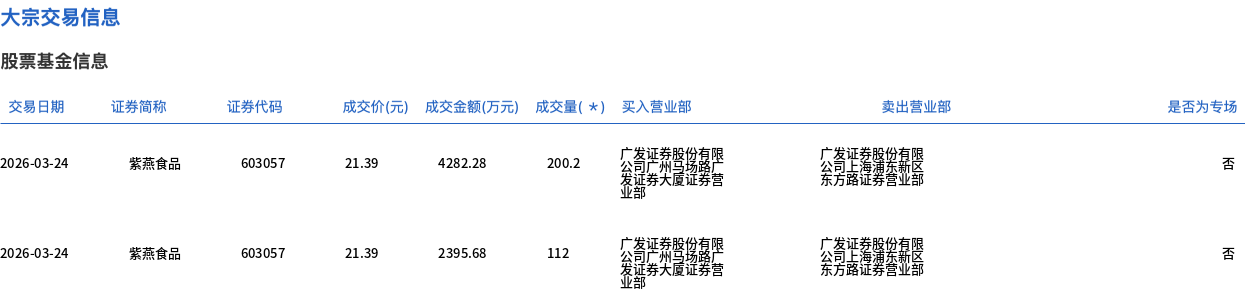 3月24日,紫燕食品大宗交易成交312.2万股,成交额6677.96万元,占当日总成交额的36.18%,成交价21.39元,较市场收盘价23.9元折价10.5%。
