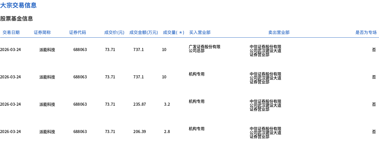 3月24日,派能科技大宗交易成交37.12万股,成交额2736.12万元,占当日总成交额的1.99%,成交价73.71元,较市场收盘价81.2元折价9.22%。