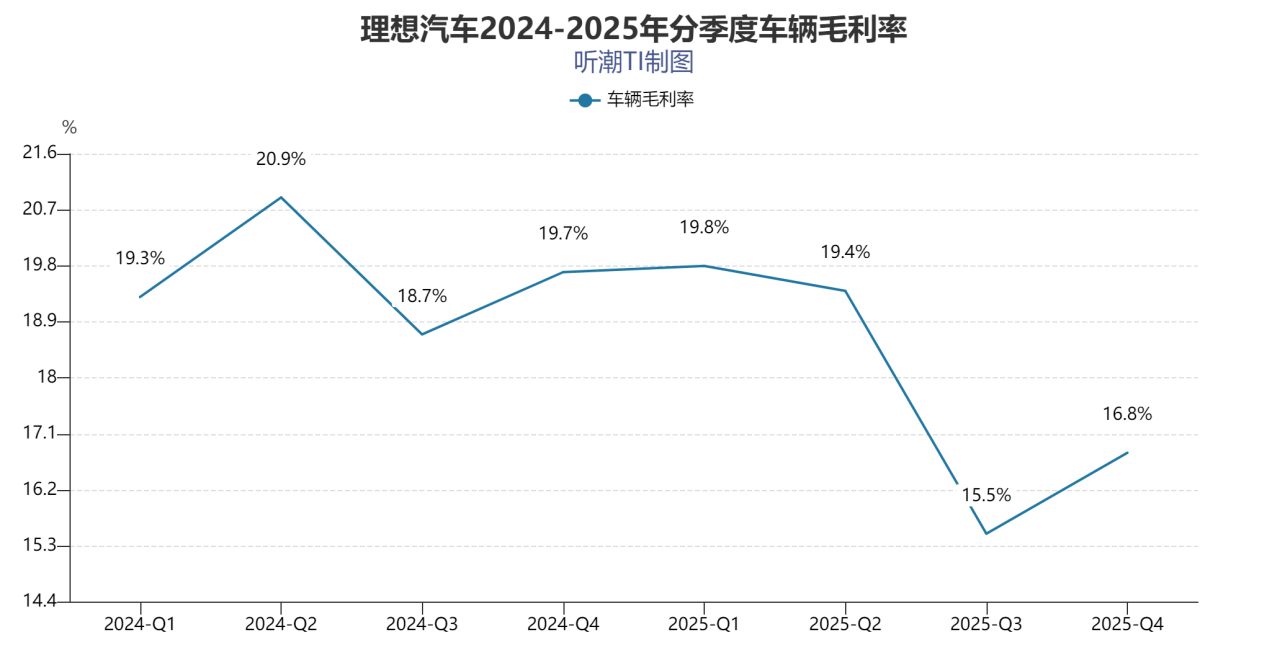 从财务数据上看,理想汽车的车辆毛利率在2025年总体呈持续下滑态势,从一季度的19.8%下滑至四季度的16.8%,最低曾触及三季度的15.5%。