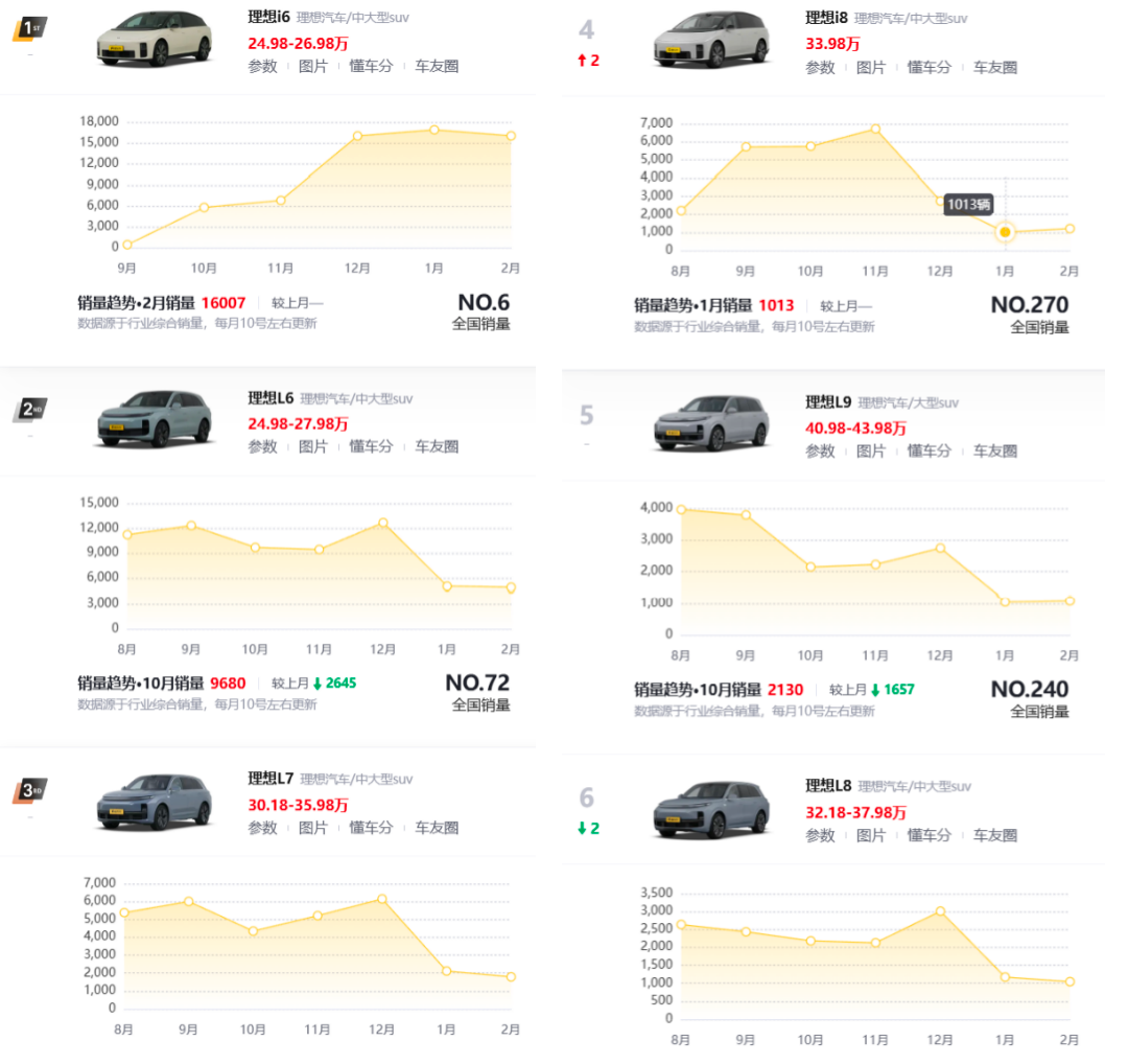 而上述月销量数据与前几个月对比,销量下滑幅度几乎全部达到腰斩水平。要知道的是,理想L系列曾创下月销量5万辆的成绩,而今的销量只有1万辆左右。