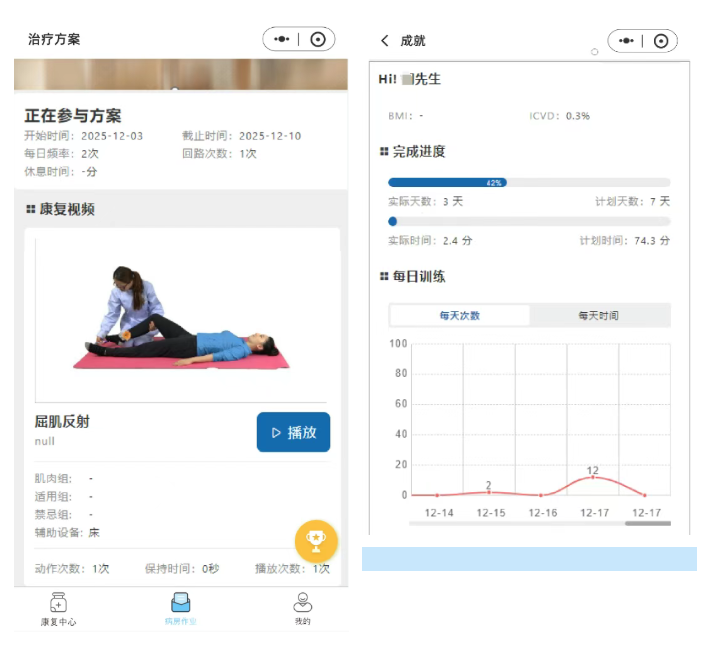 大医云康自主研发的“基于人工智能的康复治疗知识库系统”以AI技术为核心,围绕康复医学科的真实场景与业务闭环,打造覆盖评估、计划、执行、跟踪、管理全流程的智慧康复解决方案。该系统不仅服务于院内科室的专业治疗与管理,更延伸至患者病房持续康复训练,实现“治疗-训练-反馈”的全程数字化闭环。