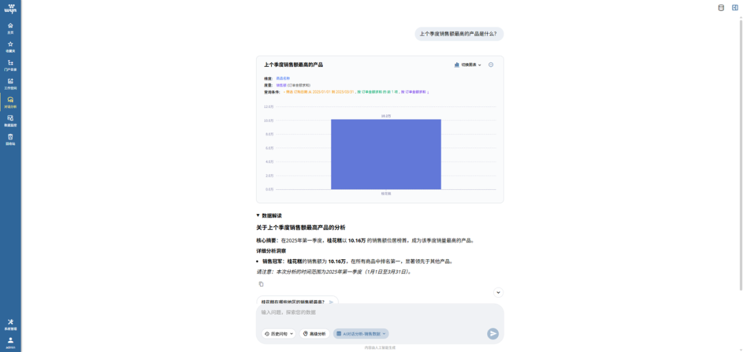 葡萄城Wyn商业智能借助自然语言处理(NLP)和机器学习技术,数据分析工具已经能够理解人类的语言,并以对话的形式完成复杂的任务。WynBI支持多维度的数据探索。用户可以通过连续的提问逐步深入,比如从整体趋势到具体细节,再到异常点的排查。此外,不论是存储在Excel、数据库还是云端平台的数据,Wyn商业智能都能轻松接入,实现一站式分析,还能提供丰富的可视化组件,包括柱状图、折线图、饼图等。