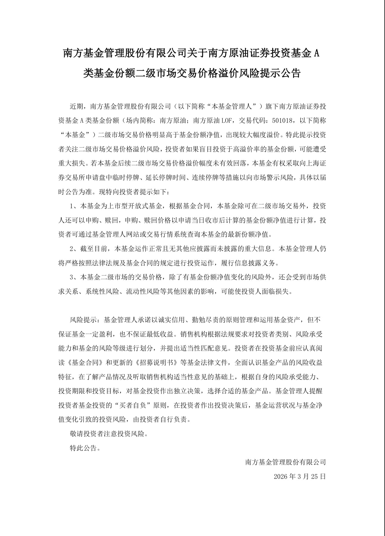 3月25日,南方基金管理股份有限公司发布公告称,公司旗下南方原油证券投资基金 A 类基金份额(场内简称:南方原油;南方原油 LOF,交易代码:501018)二级市场交易价格明显高于基金份额净值,出现较大幅度溢价。特此提示投资者关注二级市场交易价格溢价风险,投资者如果盲目投资于高溢价率的基金份额,可能遭受重大损失。若后续二级市场交易价格溢价幅度未有效回落,南方原油 LOF(501018)有权采取向上海证券交易所申请盘中临时停牌、延长停牌时间、连续停牌等措施以向市场警示风险,具体以届时公告为准。