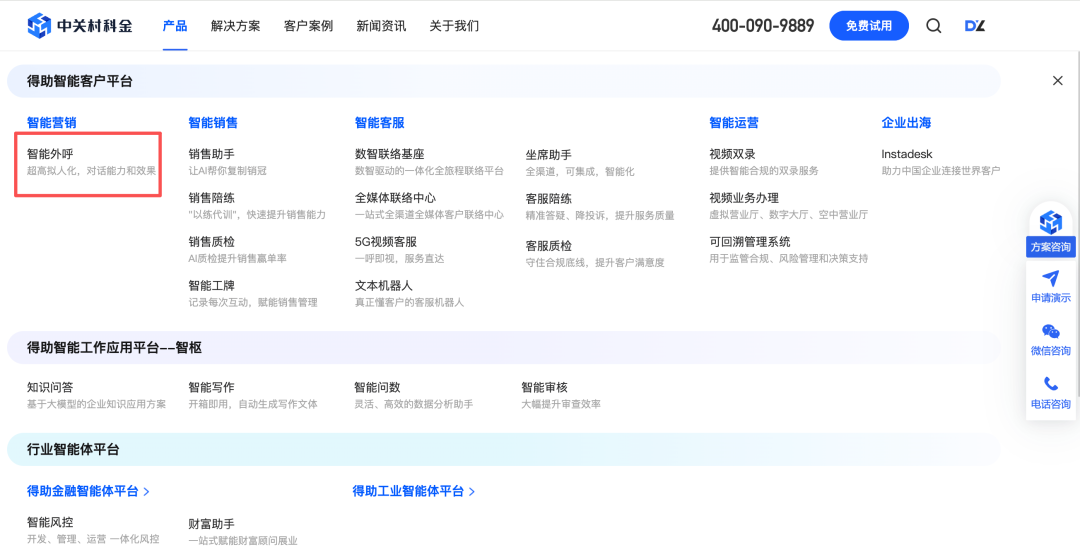 “智能外呼”位于其官网产品第一位