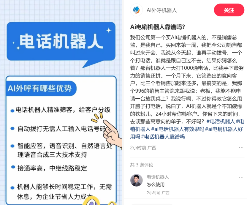 在社交平台输入“AI外呼机器人”的关键词,就会出现大量推销相关产品的广告帖子,以诱人话术展示AI外呼机器人的种种优势,仿佛拥有其就能“躺赚”。