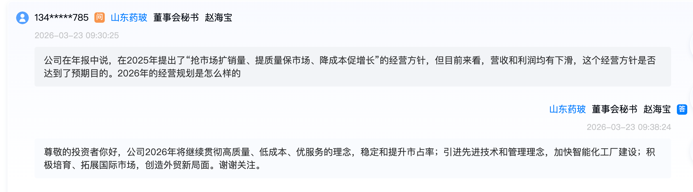 面对业绩压力,山东药玻在业绩说明会上阐述了其应对策略与未来规划。赵海宝表示,公司2026年将继续贯彻高质量、低成本、优服务的理念,以稳定和提升市场占有率;同时将引进先进技术和管理理念,加快智能化工厂建设;并积极培育和拓展国际市场,开创外贸新局面。