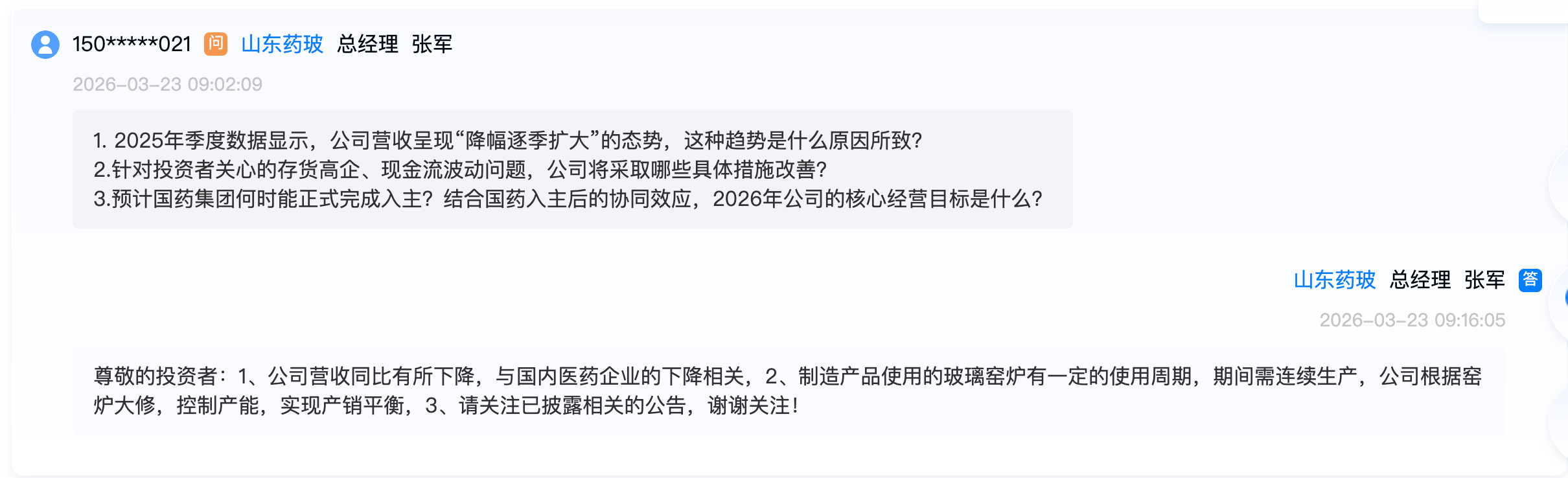 2026年3月23日,山东省药用玻璃股份有限公司(证券代码:600529)通过上证路演中心网络平台召开了2025年年度业绩说明会。据公司此前于2026年3月7日发布的《山东省药用玻璃股份有限公司2025年年度报告》(以下简称“2025年年报”),这家国内药用玻璃包装龙头企业去年出现了营收与净利润的双下滑。