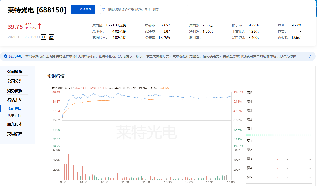 3 月 25 日,A 股硬科技赛道集体活跃,光通信 / CPO与显示材料方向情绪高涨,陕西板块莱特光电 (688150)顺势爆发,全天震荡上行,以+11.59% 的涨幅领跑板块,成为当日陕西板块最抢眼标的。