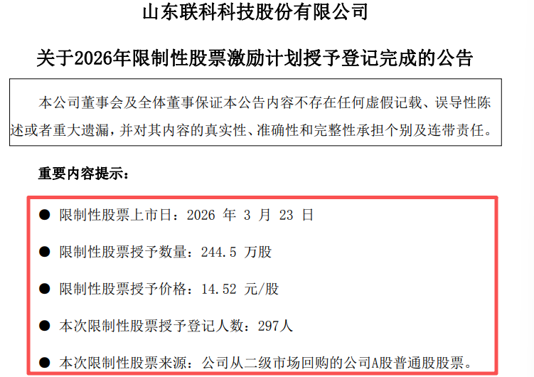 3月24日,山东联科科技股份有限公司(代码:001207;简称:联科科技)披露《关于2026年限制性股票激励计划授予登记完成的公告》。至此,这场覆盖297名核心员工(包括董事、高级管理人员、核心骨干人员)、涉及244.5万股限制性股票的激励计划正式落地。