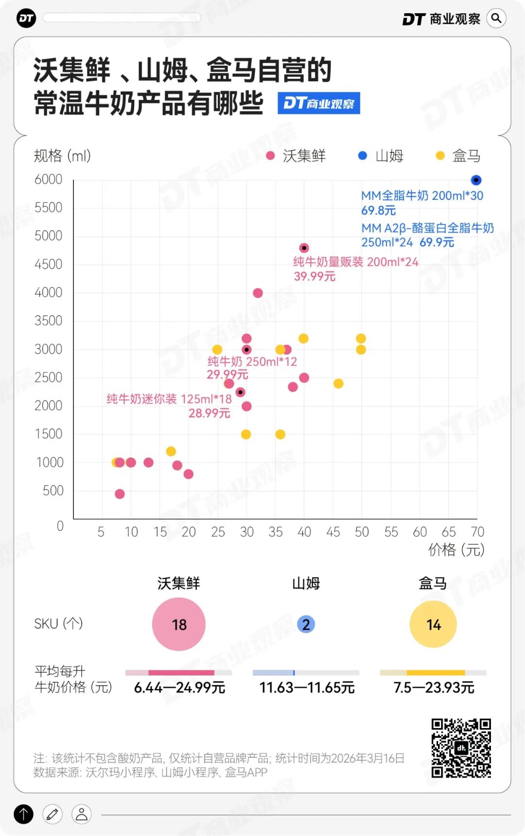 这样的SKU分布,不像山姆,更像盒马鲜生——盒马鲜生自营的常温奶SKU有14个,提供包括纯牛奶、有机牛奶、全脂/脱脂牛奶、高钙牛奶、0乳糖牛奶等多种选择,价格带在7.5到23.93元之间。