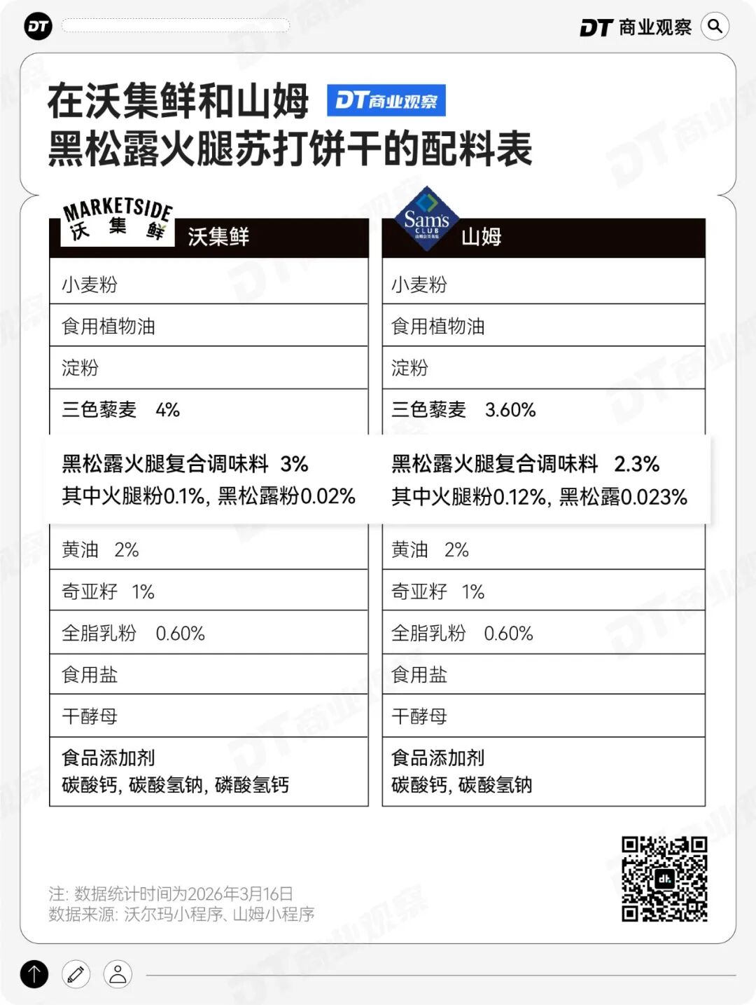 山姆的占比2.3%,其中“火腿粉”0.12%,“黑松露”0.023%,而沃集鲜的火腿粉比例略低,只有0.1%,黑松露粉则只有0.02%。