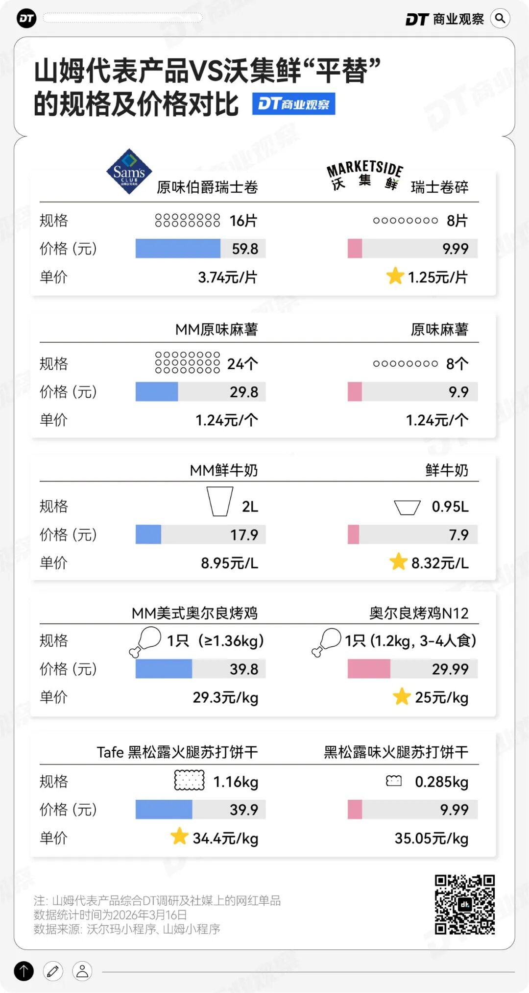 我们对比了5款山姆网红单品和沃集鲜同款的价格,分别是瑞士卷、麻薯、鲜牛奶、烤鸡和黑松露火腿苏打饼干。