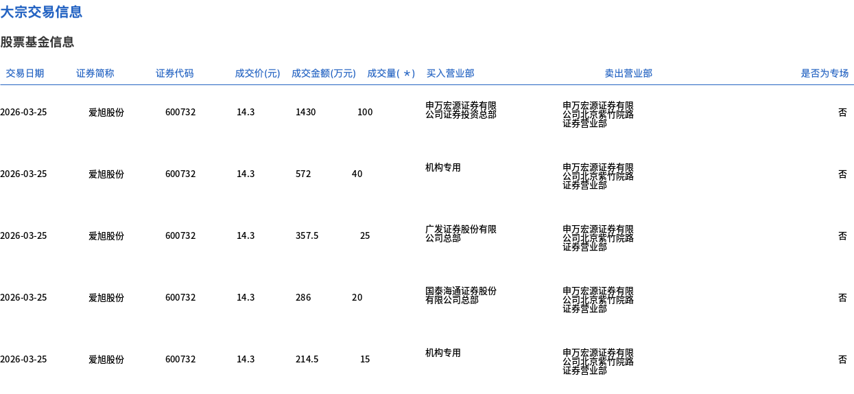 3月25日,爱旭股份大宗交易成交200万股,成交额2860万元,占当日总成交额的1.98%,成交价14.3元,较市场收盘价15.46元折价7.5%。
