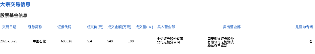 3月25日,中国石化大宗交易成交100万股,成交额540万元,占当日总成交额的0.36%,成交价5.4元,较市场收盘价5.92元折价8.78%。