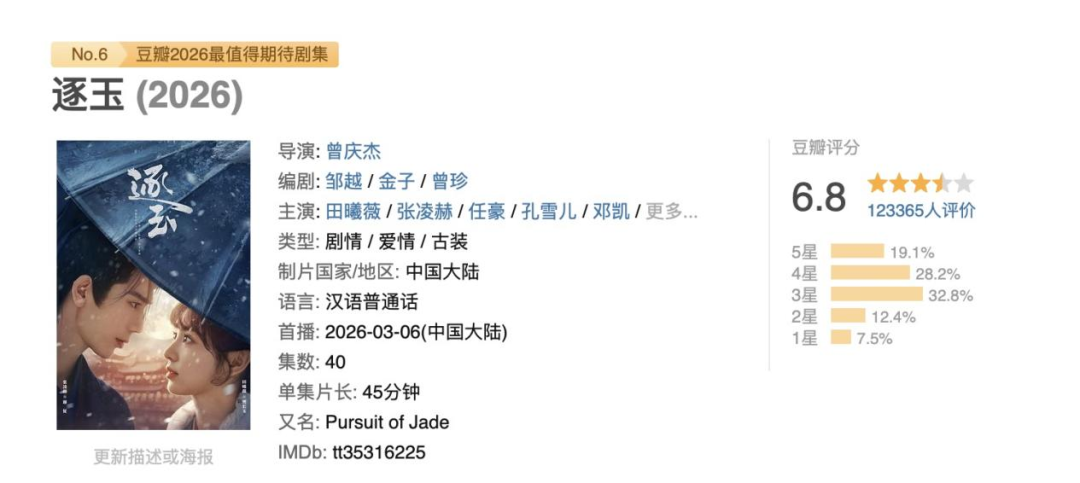 一连串“夯爆了”的数据,让《逐玉》为长剧市场带回了久违的现象级热度,但同时也引爆了全网关于“爆剧标准”的激烈争议,甚至一度引发外界对平台数据口径与公信力的质疑。而姗姗来迟的6.8豆瓣开分,固然印证了《逐玉》具备基本的内容基底与制作水准,可仅12万出头的评分人数,还是再次直观暴露了其在全民影响力上的薄弱。