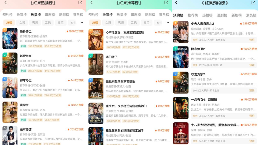 截止发稿,《隐身侍卫2》《以爱为家2》在红果预约榜上的期待值仅次于《少夫人来自东北2》,分别位列TOP2、TOP3,足见前作积攒的口碑与人气已成功转化为强大的续作号召力。