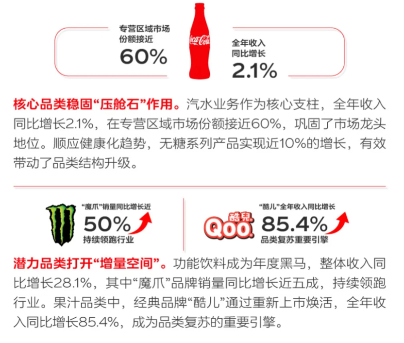分品类看,年内,公司含糖及无糖汽水收入均实现增长,无糖品类更录得高个位数增长。公司经营区域内汽水品类市占率近60%。汽水品类销量同比保持稳定,收入同比实现近2%增长。(公司公告、财经网)