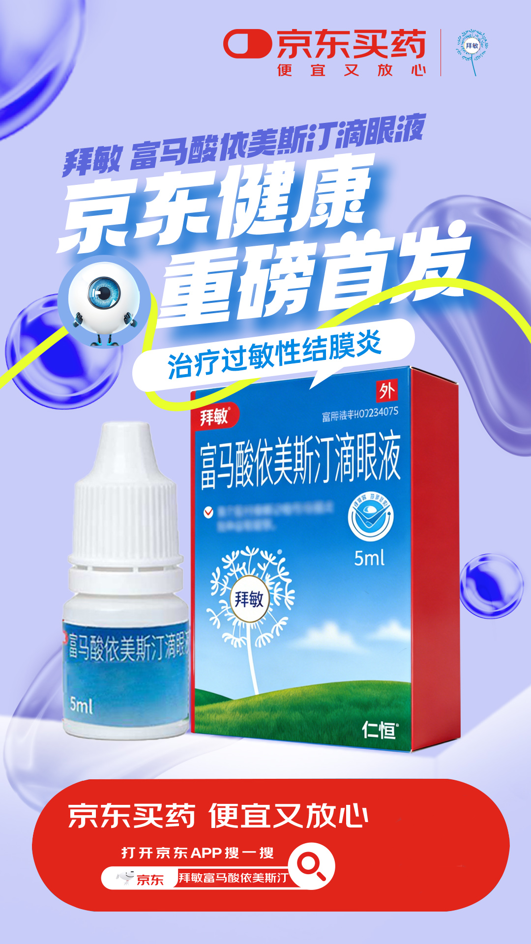 京东健康作为“新特药全网首发第一站”,将充分发挥全域营销资源、高效供应链体系与专业医药服务的核心优势,助力拜敏®快速触达全国各级城市的患者群体,让这款国产优质抗过敏眼药走进千家万户;同时,京东健康提供的专业用药咨询服务,将为患者提供个性化的用药指导,从贮藏、用法用量到用药注意事项全流程解答,保障患者用药安全、规范,彻底解决购药、用药的后顾之忧。