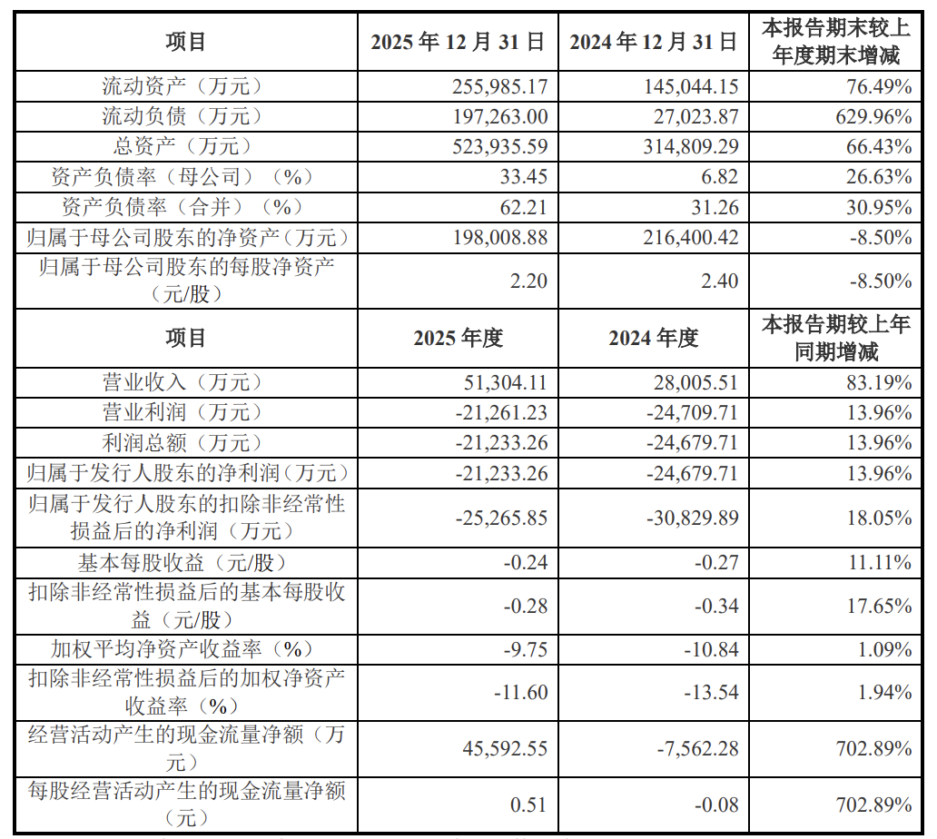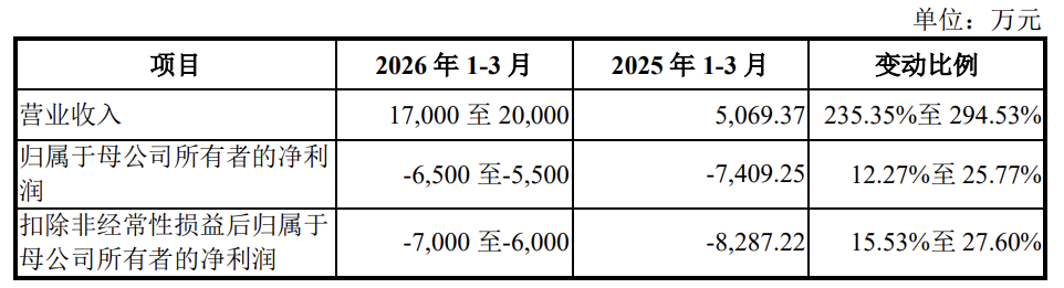 在此基础上,综合考虑业务扩张的规模效应、在手订单、产品成熟度提高、研发商业化成效等因素,公司预计2026年一季度营业收入同比呈快速增长趋势,预计增幅为235.35%至 294.53%。同时,扣除非经常性损益后归属于母公司所有者的净利润亏损同比收窄,预计减亏幅度为15.53%至 27.60%,经营业绩不断改善。