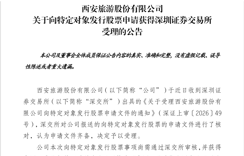 2026年3月25日,西安旅游(SZ000610,股价9.25元,市值21.90亿元)发布公告称,公司2025年度向特定对象发行股票申请已获得深交所受理。此次定增计划拟向控股股东西安旅游集团有限责任公司(以下简称西安旅游集团)发行不超过3061.22万股A股股票,募集资金总额不超过3亿元,全部用于补充流动资金及偿还银行贷款。这一动作发生在公司面临退市风险警示的关键时刻,被部分媒体称为控股股东对上市公司的“输血”支持。