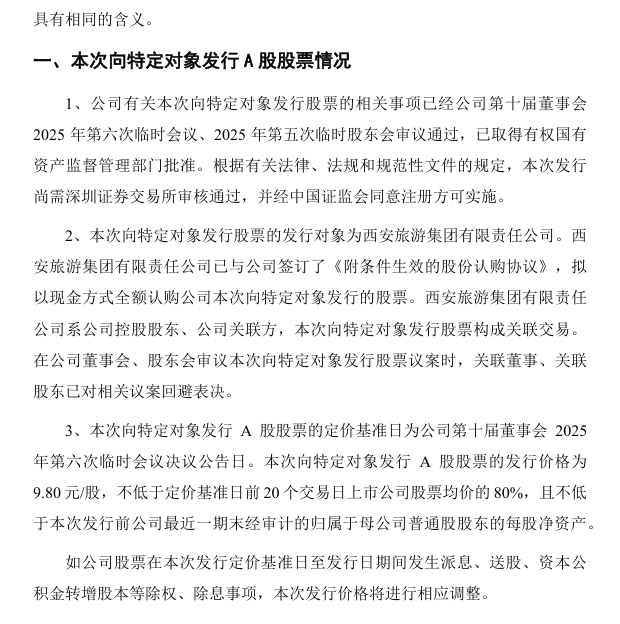发行完成后,西安旅游集团持股比例将超过30%,触发要约收购义务(即大股东持股超过一定比例后,必须向所有小股东发出的“公平收购邀请”)。但公告介绍,由于“关于认购对象免于发出收购要约的议案”已获股东大会审议通过,且西安旅游集团已承诺36个月锁定期,因此符合《上市公司收购管理办法》第六十三条规定的免于发出要约情形。