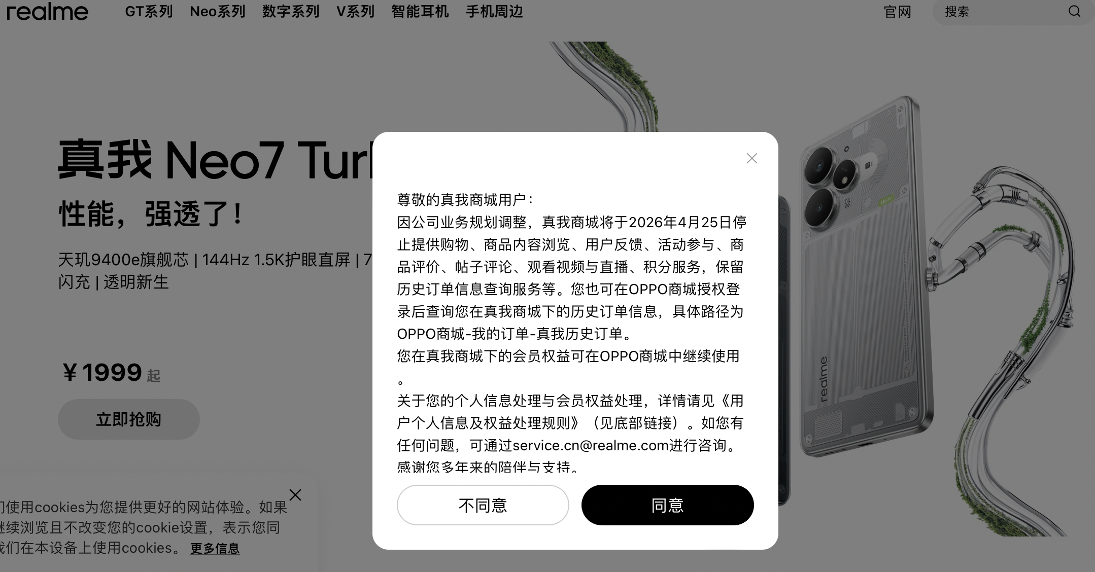 此外,真我服务小程序将于2026年4月20日整体停止运营并下线,真我商城小程序将于2026年4月25日下架。