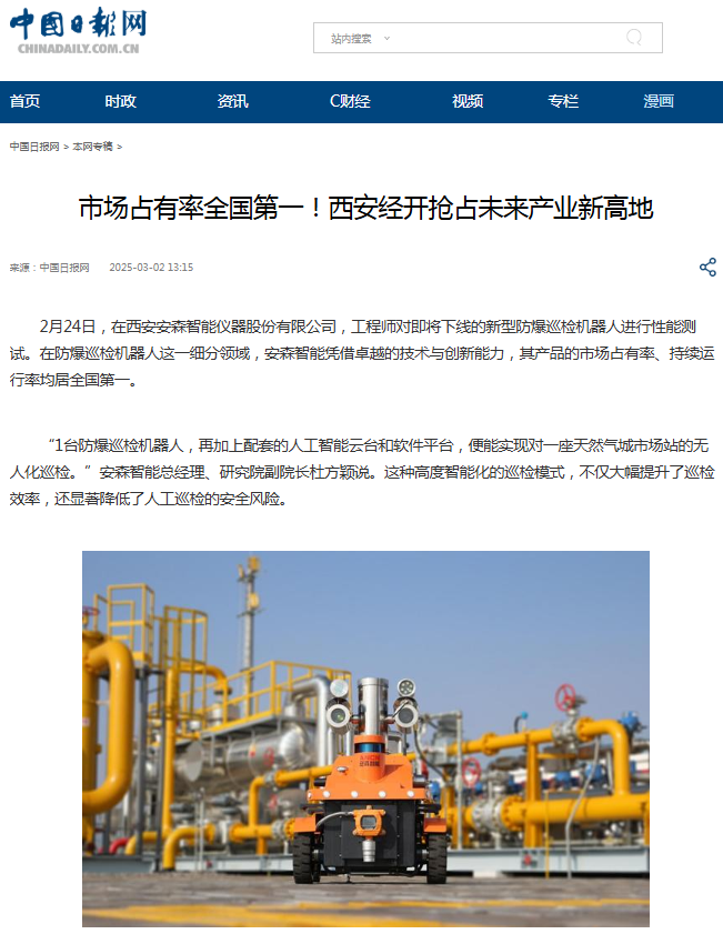 3月2日,中国日报网以《市场占有率全国第一!西安经开抢占未来产业新高地》为题,围绕西安经开区多个新兴产业的最新科技成果进行了报道。