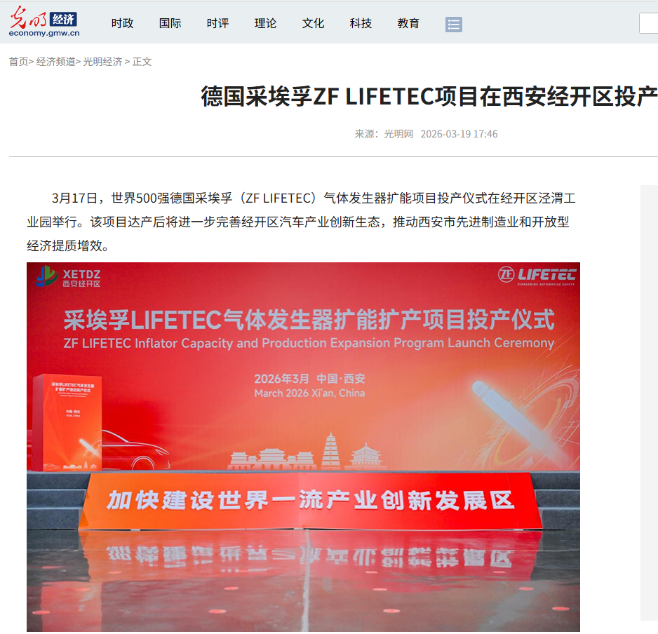 3月17日,光明网、国际在线、中国网纷纷报道了世界500强德国采埃孚(ZF LIFETEC)气体发生器扩能项目在经开区泾渭工业园举行的投产仪式。据悉,此次投产,既是采埃孚深耕中国市场的关键一步,也是其与经开区合作深化的最新成果。
