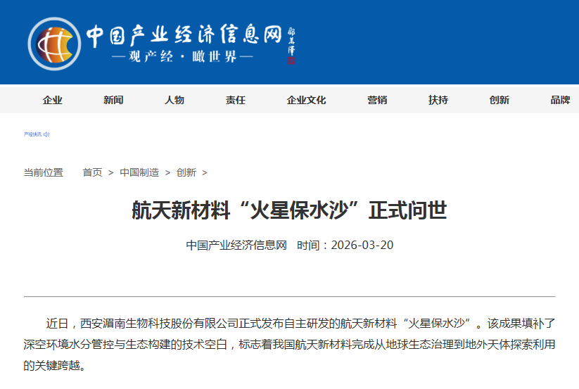 3月20日,中国产业经济信息网以《航天新材料“火星保水沙”正式问世》为题,报道了西安湄南生物科技股份有限公司正式发布自主研发的航天新材料“火星保水沙”。