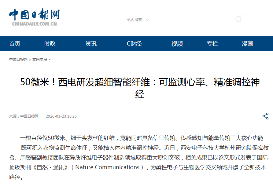 3月23日,中国日报网报道了西安电子科技大学杭州研究院保宏教授、周赟磊副教授团队在异质纤维电子器件制造领域取得重大原创突破,并指出,相关成果已以论文形式发表于国际顶级期刊《自然・通讯》(Nature Communications),为柔性电子与生物医学交叉领域开辟了全新技术路径。