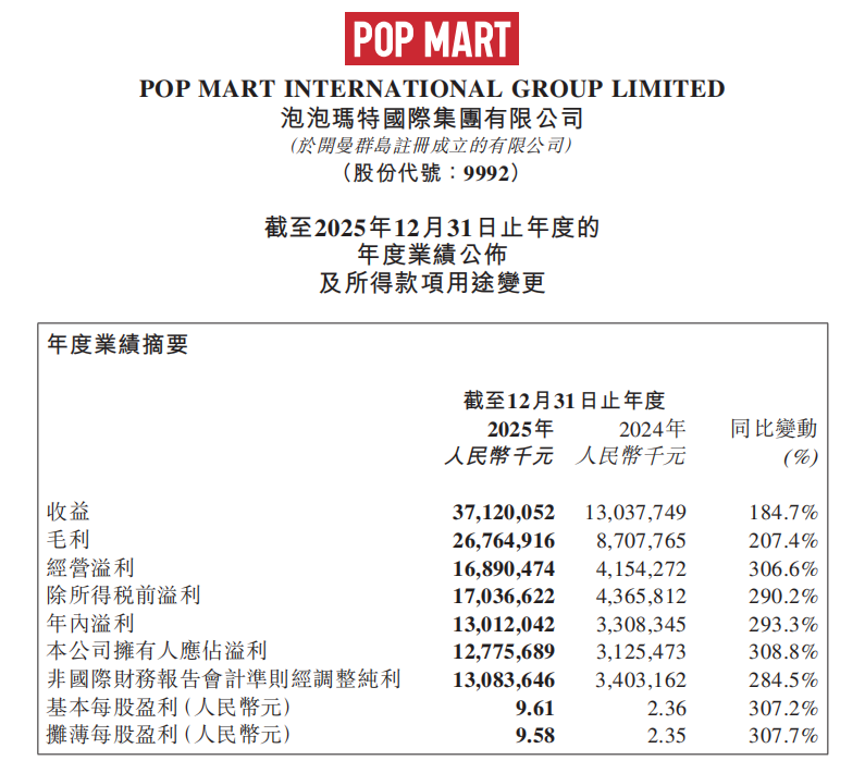 财报显示,2025年,泡泡玛特收入371.2亿元,较2024年同比增长了184.7%;净利润130.12亿元,同比增长293.3%;2025年经调整净利润130.84亿元,同比增长了284.5%,经调整的净利润率为35.2%。