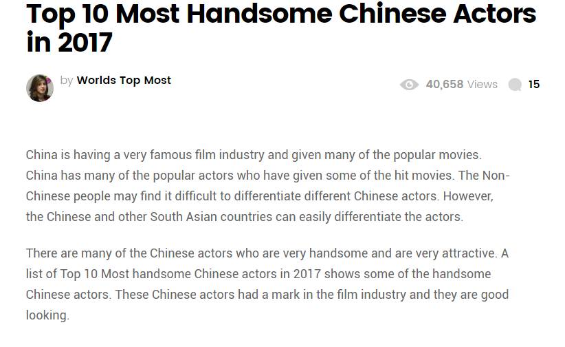 在美国著名盘点网站World’s Top Most总结的2017年度“中国最帅面孔”榜单中,排名前十的男星依次是:李易峰、刘德华、陈伟霆、鹿晗、郑凯、陈晓、陈赫、吴亦凡、华晨宇、魏晨。