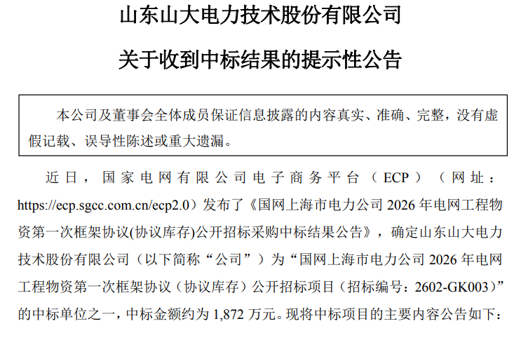 3月25日,山东山大电力技术股份有限公司(代码:301609 ;简称:山大电力)发布公告称,公司成功中标“国网上海市电力公司2026年电网工程物资第一次框架协议(协议库存)公开招标项目”,中标金额约为1872万元,中标品类为线路在线监测装置-线路故障定位装置。