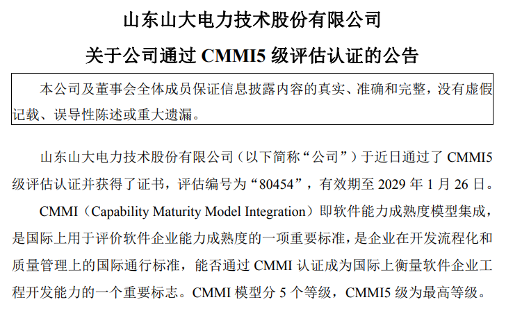 3月2日,山大电力公告宣布通过全球软件能力成熟度模型集成最高等级——CMMI5级评估认证,评估编号为:80454,有效期至2029年1月26日。CMMI(Capability Maturity Model Integration)是国际上用于评价软件企业能力成熟度的一项重要标准,是企业在开发流程化和质量管理上的国际通行标准,能否通过CMMI认证成为国际上衡量软件企业工程开发能力的一个重要标志。CMMI模型分5个等级,CMMI5级为最高等级。