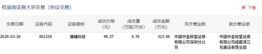 3月26日,趣睡科技大宗交易成交6.76万股,成交额313.46万元,占当日总成交额的6.25%,成交价46.37元,较市场收盘价51.52元折价10%。
