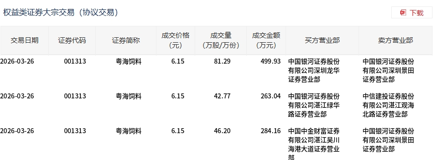 3月26日,粤海饲料大宗交易成交170.26万股,成交额1047.13万元,占当日总成交额的17.94%,成交价6.15元,较市场收盘价6.87元折价10.48%。