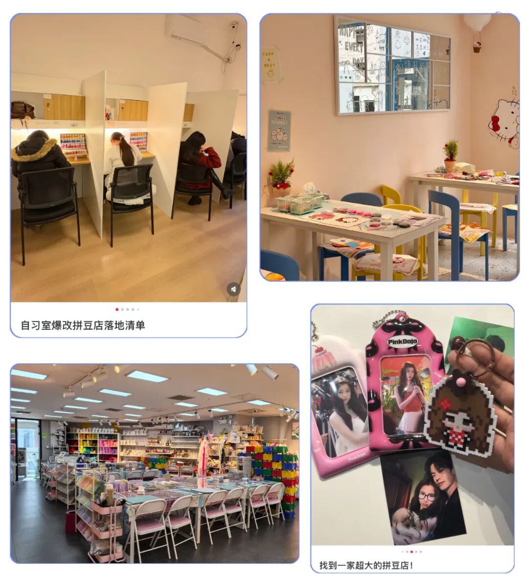 城市里,最先吃到红利的是手作连锁店。它们本身店里的闲置空间就够多,补齐221色拼豆、拼豆工具、烫画机等刚需材料,添置合适的桌椅灯具。投入一两万就够了,换来的客流却是五倍十倍。有商家告诉我们,拼豆一个项目,就能把整体房租赚回来。