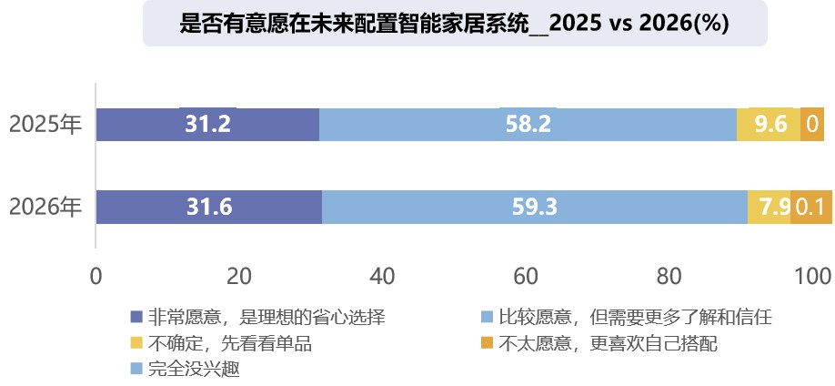 目前,汽车消费基本从“崇拜发动机工艺”转向“追求智能体验”,智能座舱、自动驾驶成为消费者选购的核心考量。家电也正经历类似的迭代,尽管智能家电、AI家电在消费市场上噱头大于实用,但在AI时代,消费者2025年对智能家居系统的配置意愿为89.4%,2026年,上升为90.9%。